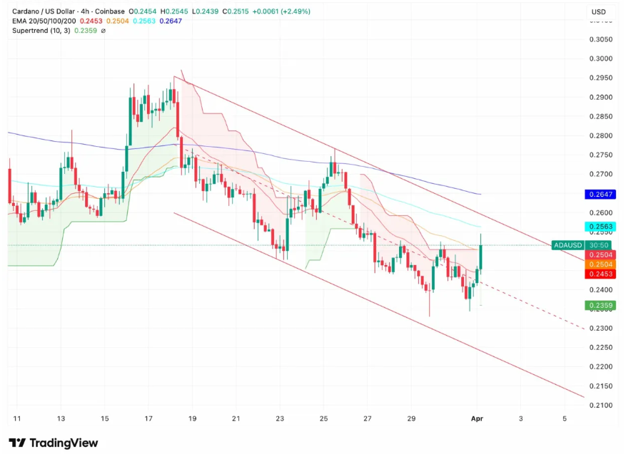 Cardano的ADA于4月1日摆脱持续两周的下降通道,释放短期动能转换信号。此次突破推动价格站上0.2453至0.2563美元区间密集分布的多条指数移动平均线。此外,ADA回升至0.2515美元附近,强化了自三月中旬高点回落后开启复苏周期的叙事。超级趋势指标亦在0.2359美元转为支撑位,反映出新的买盘压力正在形成。