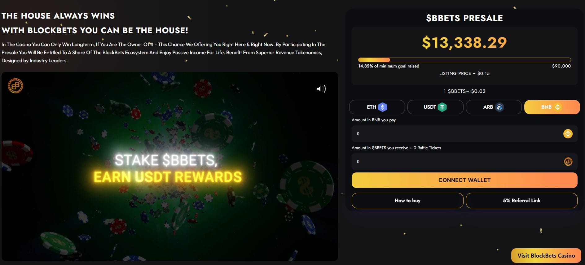 Blockbets 是一个有前景的在线游戏平台,目前正处于预售阶段。它旨在成为在线游戏的首选目的地。$BBETS 代币为投资者提供了独特的机会,包括被动质押收益和赌场积分。