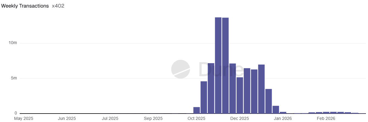 Dune Analytics数据显示,x402协议的交易量在去年11月达到峰值,随后在2026年趋于平静。