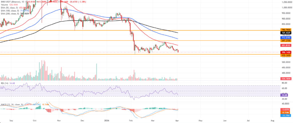 BNB交易于590美元附近,同时仍位于其50日、100日和200日指数移动均线下方。这些指标继续在当前价格上方呈上行斜率,强化了看跌结构。此外,多次未能收复这些水平使得卖压持续存在。