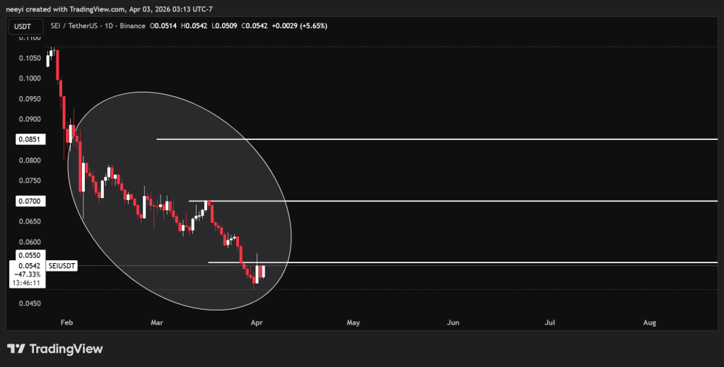 近期价格走势显示SEI在数月持续下跌后正尝试于0.05美元区域附近企稳。市场已从年初约0.12美元下行至0.054美元附近,形成清晰下降轨迹。