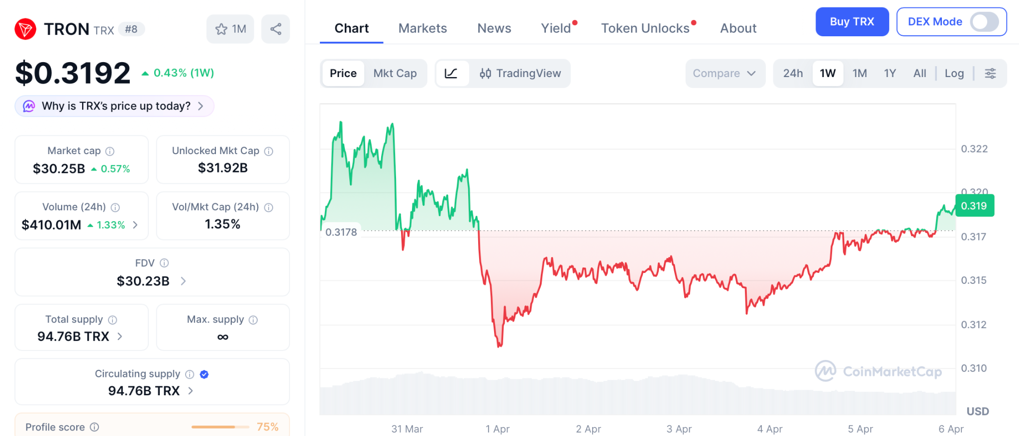 据CoinMarketCap数据,TRX现报0.319美元,在4月4日多数山寨币下跌时逆势上涨近1%。该代币较历史高点0.43美元下跌26%,市值接近310亿美元。