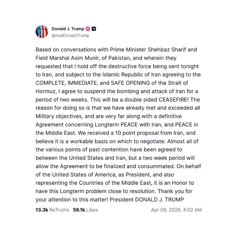 行情变动始于美国总统唐纳德·特朗普通过Truth Social宣布为期两周的停火之后。据报道,声明发布后比特币迅速跃升至72,700美元,数小时内逆转了多日的看跌布局。报告指出,在停火确认前,市场的主流预期曾严重偏向负面。