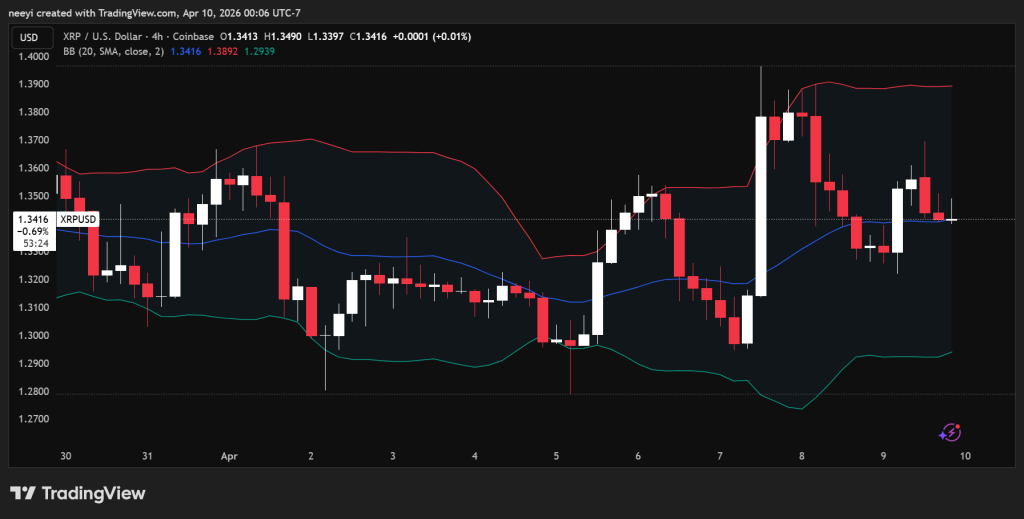 XRP上一交易时段在1.32美元至1.369美元之间交易,这与我们之前的预测高度吻合。当前价格位于约1.346美元附近,呈现横盘结构,并在时段末段略有上行倾斜。