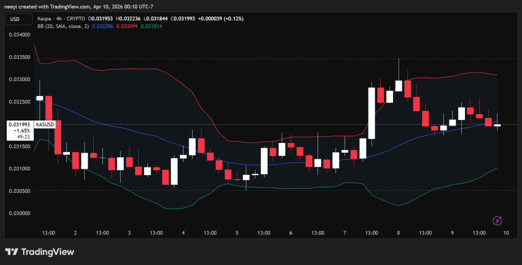 Kaspa在0.0318美元至0.0325美元的极窄区间内运行,当前价格徘徊在0.03217美元附近。这种窄幅波动表明波动性较低,但潜在结构略微偏向看跌。