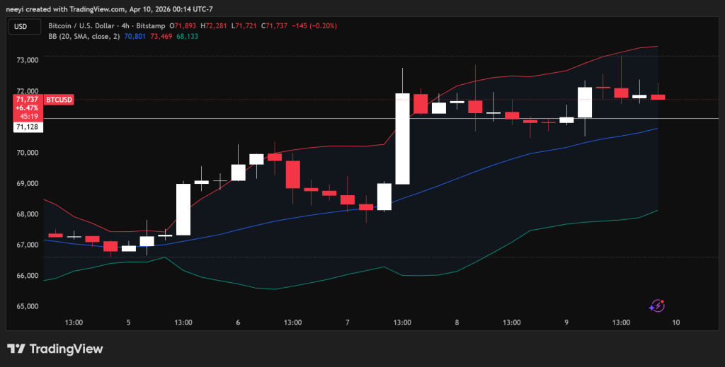 比特币过去24小时在70,550美元至73,170美元之间交易,当前价格在71,950美元左右。走势显示价格在下跌后稳步攀升,但在阻力位附近动能已经放缓。