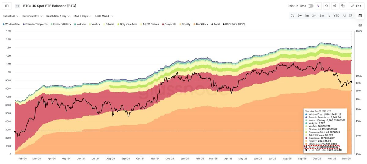 除了实体企业储备的BTC之外,截至目前,现货比特币ETF共计持有约131.1万枚BTC。其中,位居前三的分别是:贝莱德约77.7万枚,富达约20.2万枚,灰度约16.7万枚。