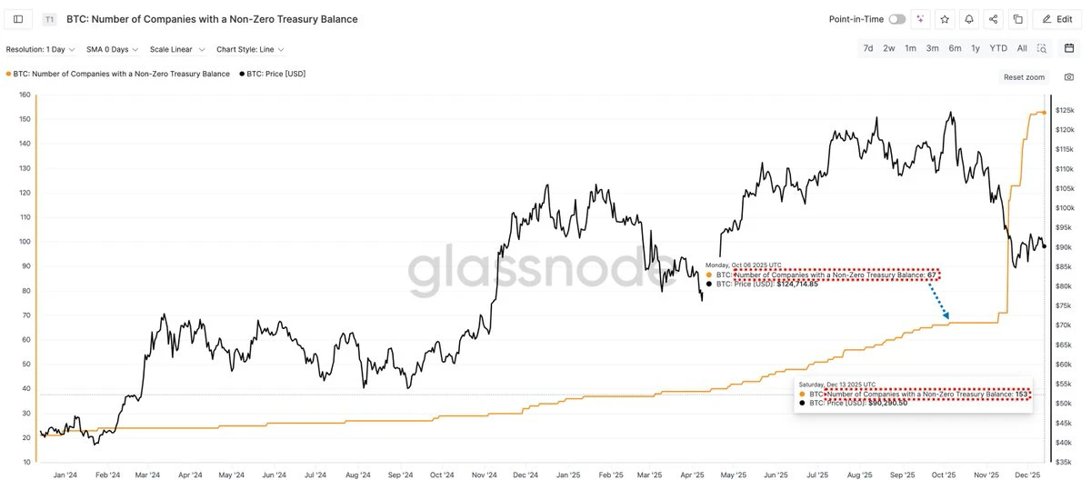这里要注意的是,在10月6日的时候,持有“BTC非零余额”的企业还仅仅只有67家,而随着BTC的深度回调,该数量突然激增,目前已经有153家了。这是否意味着,在价格下行过程中,有新的企业级玩家正在悄然入场?