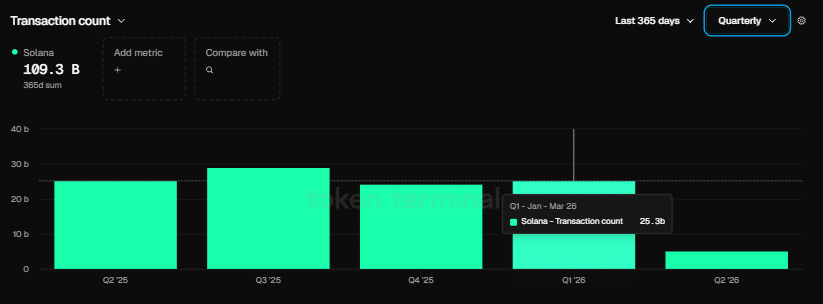 尽管价格走势疲软,Solana区块链在2026年第一季度展现出强劲扩张态势。网络在此期间处理了253亿笔交易,远超以太坊的2亿笔交易量——后者为其迄今最活跃季度。