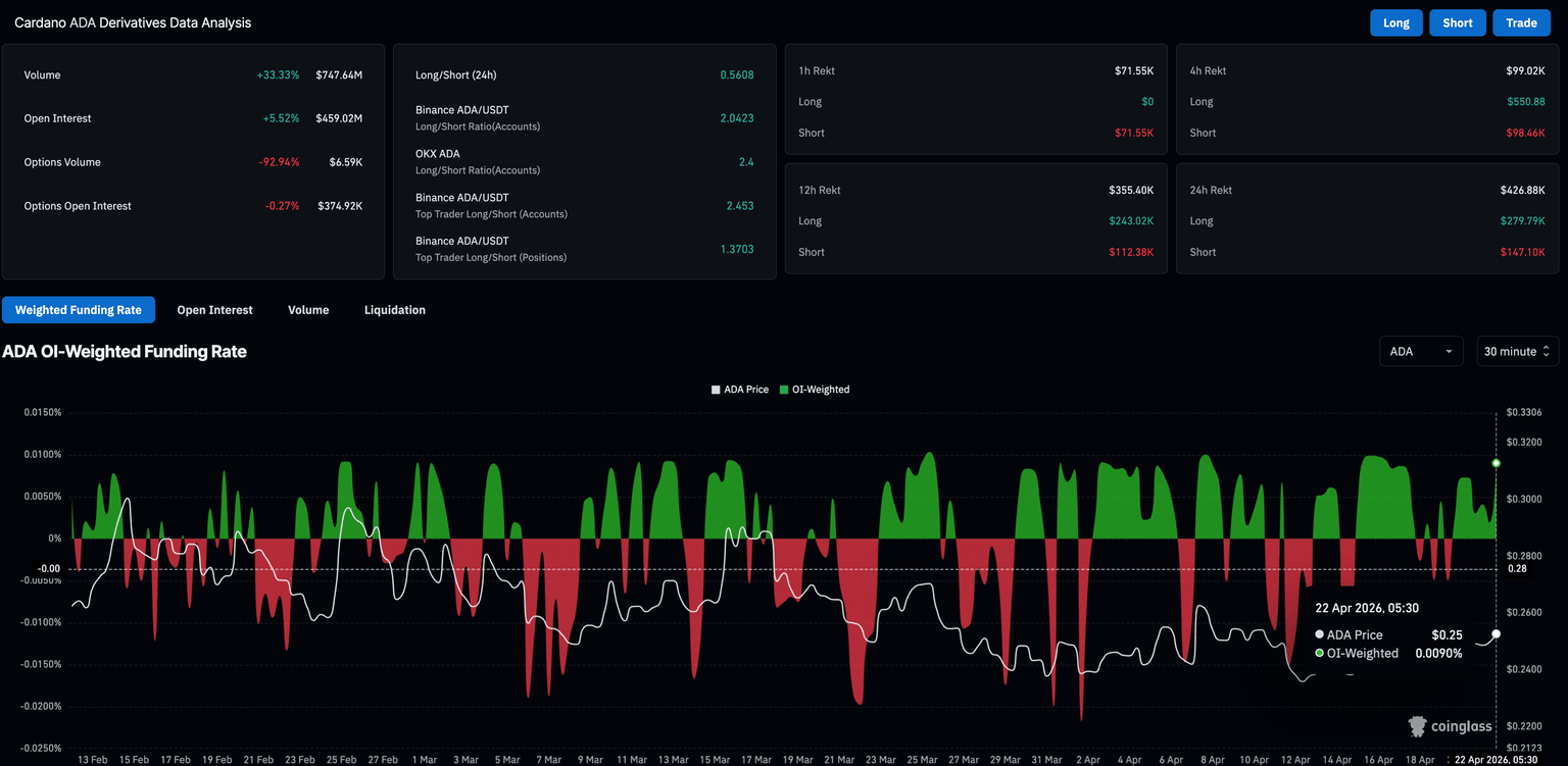 CoinGlass追踪的ADA期货未平仓合约在24小时内增长超过5%,达到4.5902亿美元。0.0090%的正资金费率表明,多头头寸持有者愿意支付溢价以维持其风险敞口。