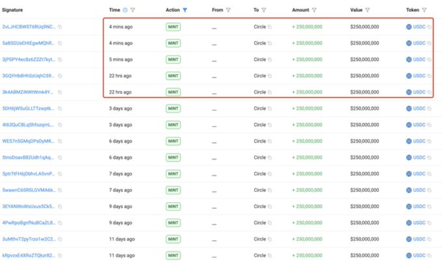 ● 从单日增发规模来看,近期出现了多次大额铸造。11月27日,Circle一次性铸造了12.5亿USDC。而更早的8月27日,Tether也曾一日内增发10亿美元USDT。这种增发节奏表明,稳定币发行商正在积极响应市场的巨大需求。