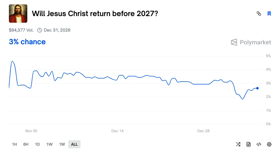 ● 事件合约链接:https://polymarket.com/event/will-jesus-christ-return-before-2027?tid=1767609729629