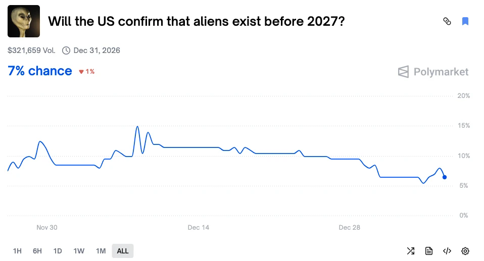 ● 事件合约链接:https://polymarket.com/event/will-the-us-confirm-that-aliens-exist-before-2027?tid=1767610632144