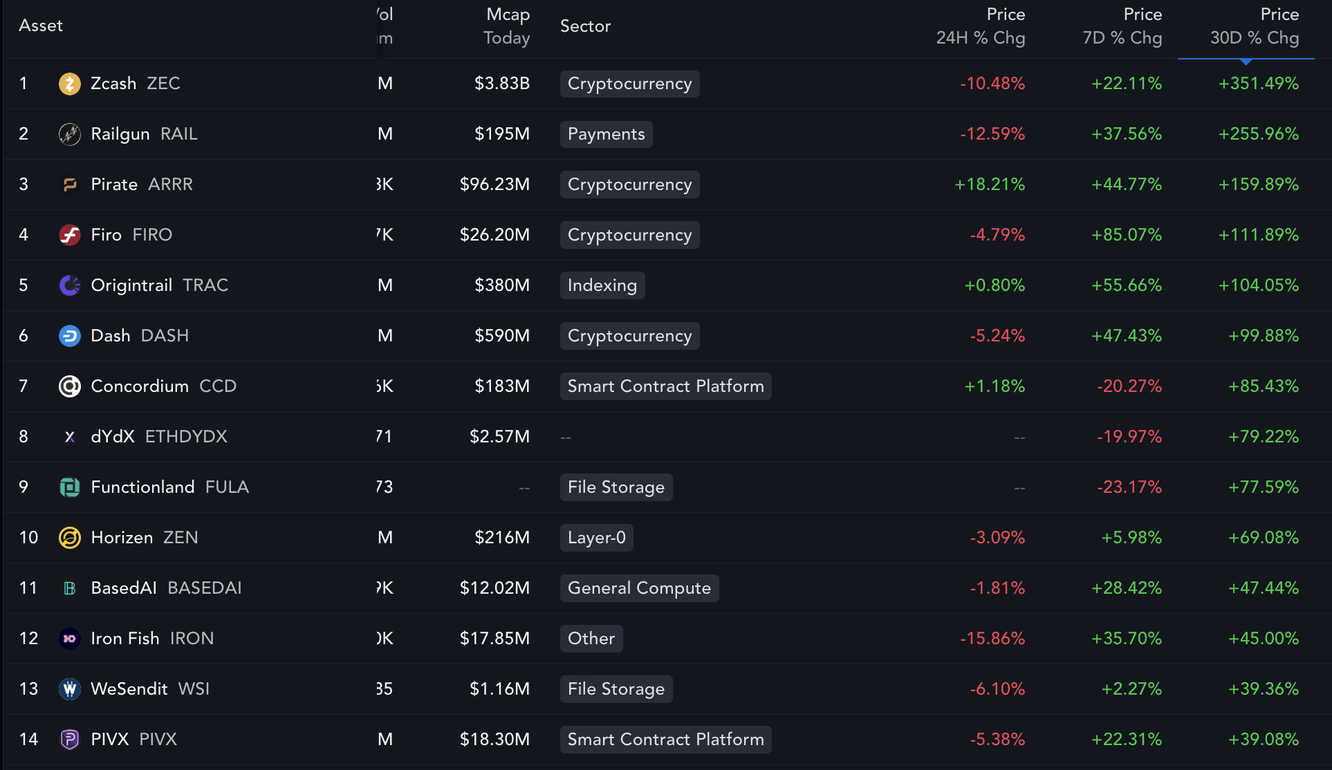 按30天涨幅排名的顶级隐私币板块表现。来源:Messari