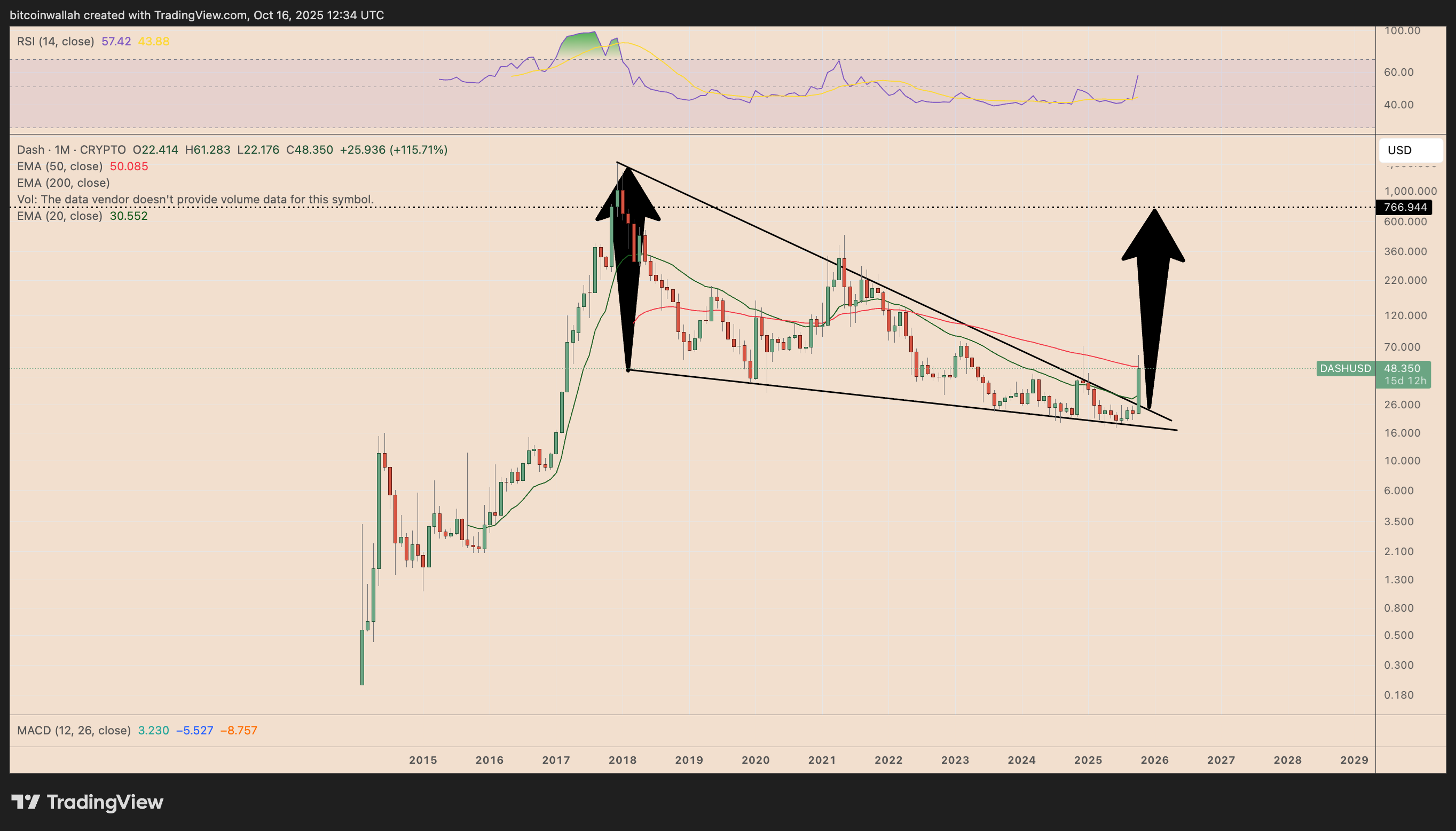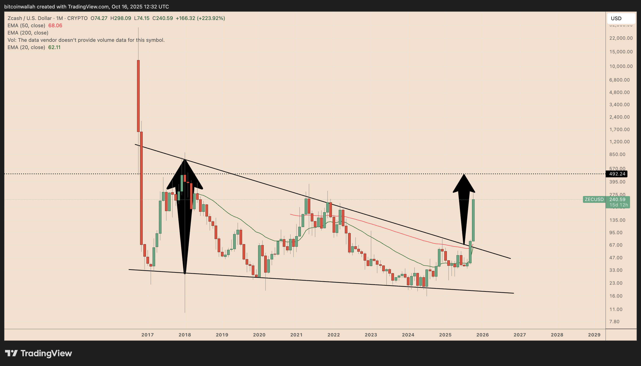 Zcash和Dash均突破多年下降楔形结构,这是一种通常预示强劲上涨延续的看涨反转信号。