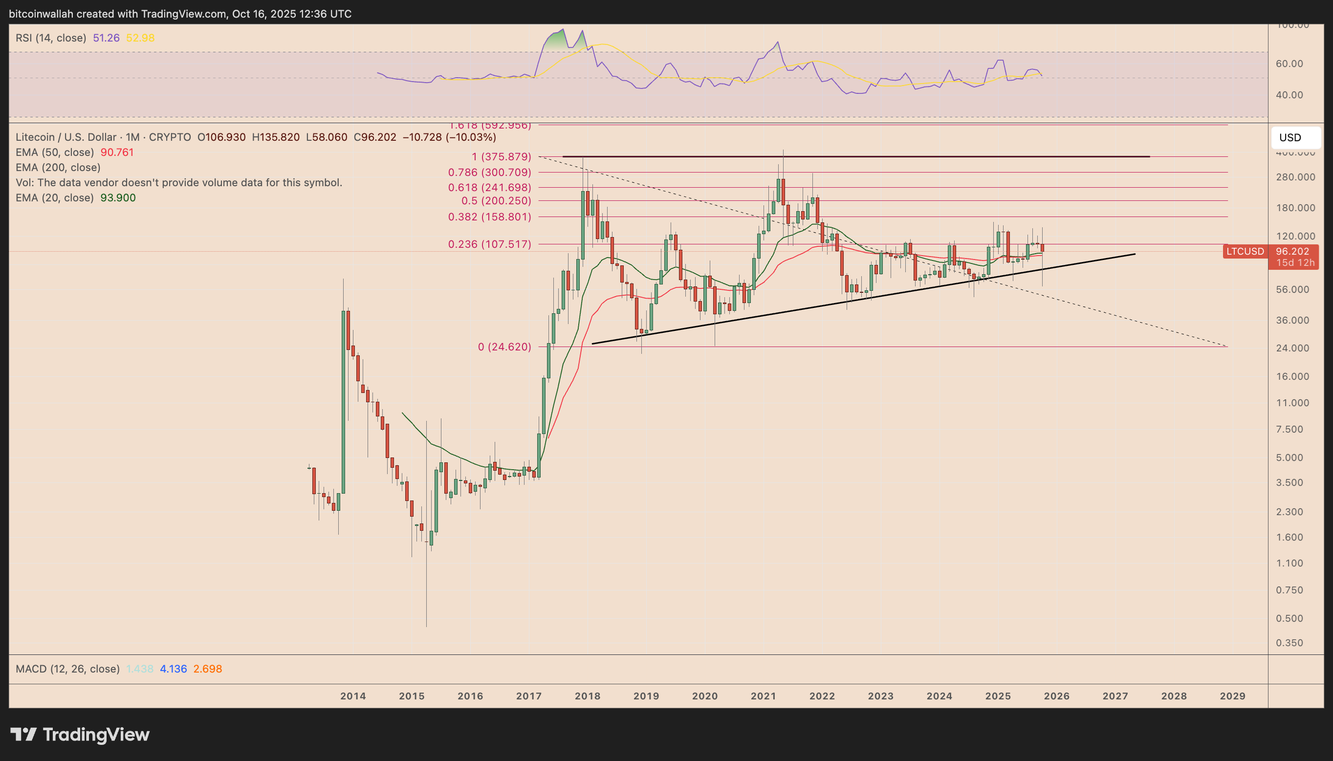 LTC仍处于一个上升三角形模式中,自2022年以来定义了一系列更高的低点。