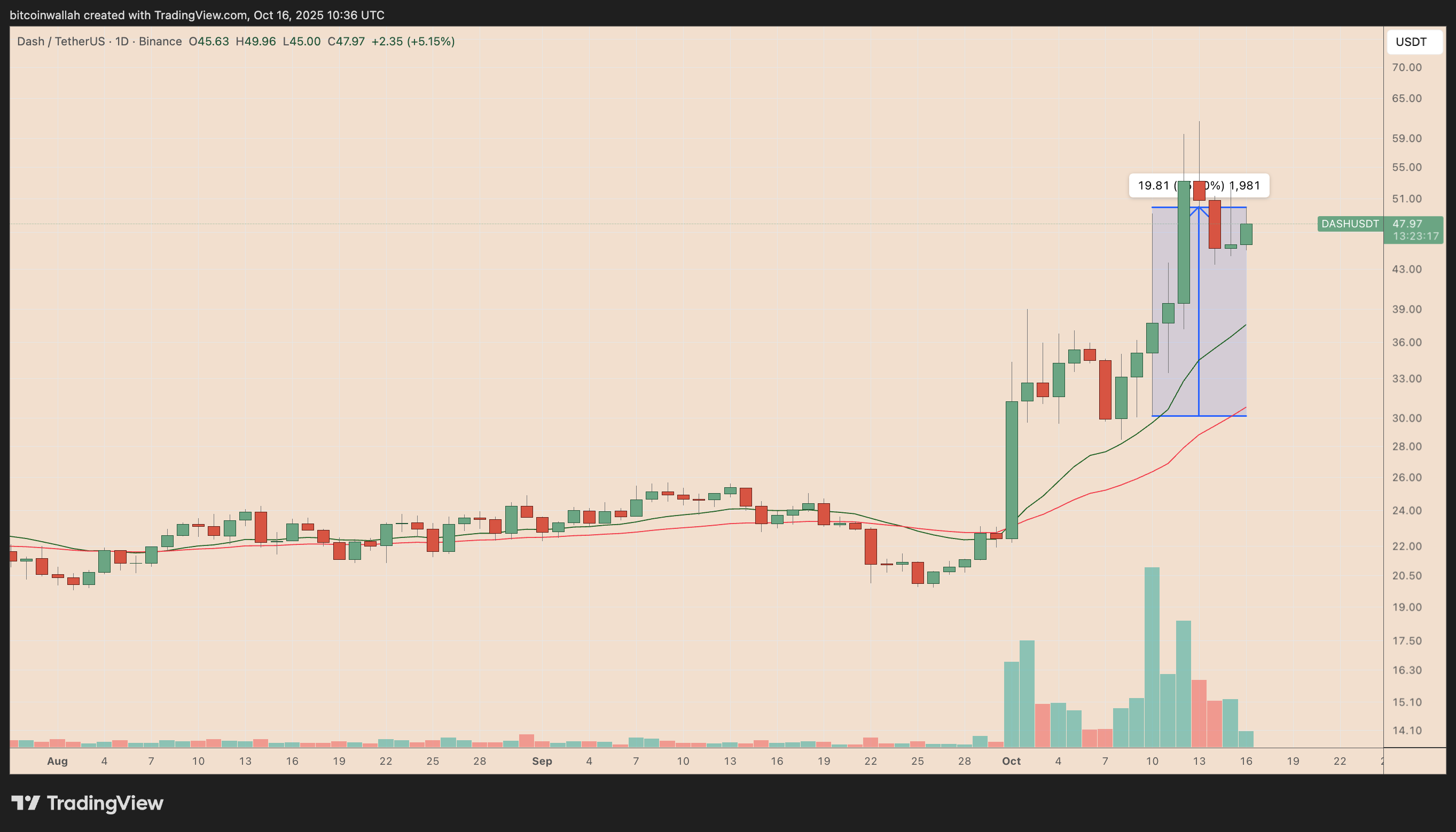 DASH自崩盘以来反弹超过65%,截至周四交易价格接近50美元。其过去一个月的回报率接近150%。