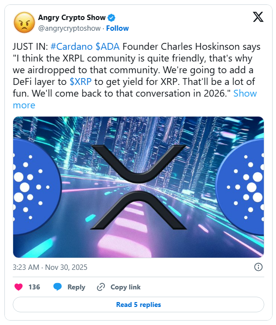 然而,这场纷争在2024年11月结束,当时Cardano创始人向XRP社区道歉。此后,Hoskinson与XRP Army的关系有所改善。现在,他公开表示XRP社区“非常友好”。