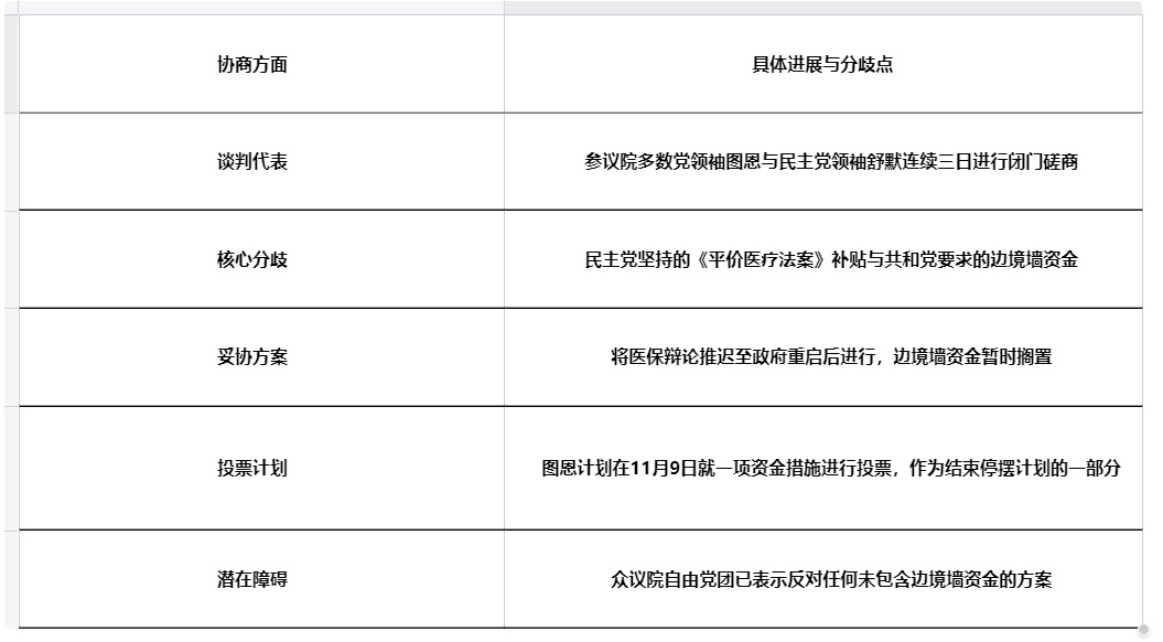在长达40天的政治角力后,两党谈判代表终于找到了可能的出路。参议院多数党领袖图恩证实,一项结束政府停摆的潜在协议正在形成,但他谨慎地表示“这并不能保证可以达成”。
