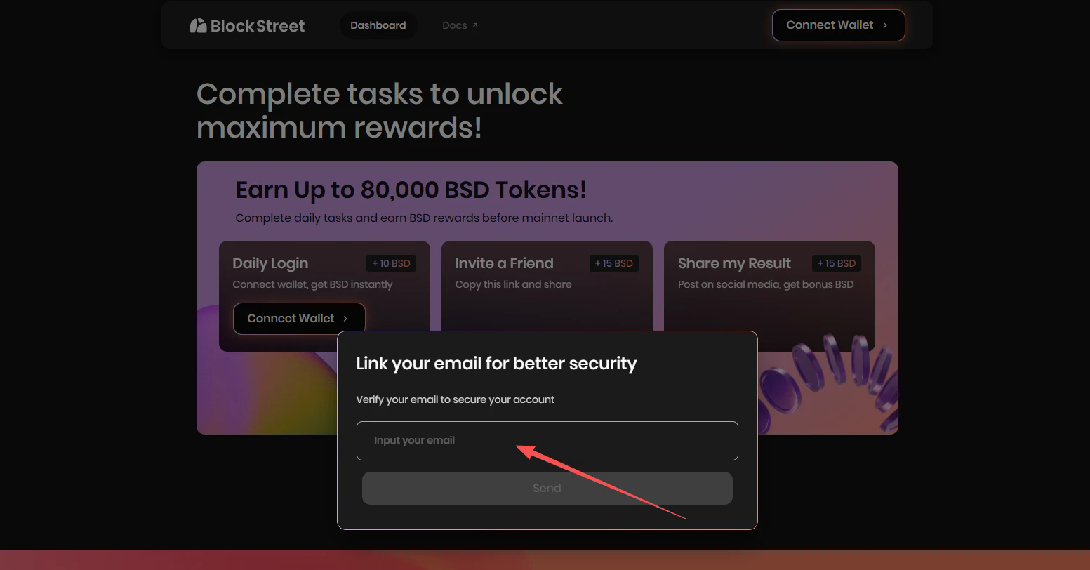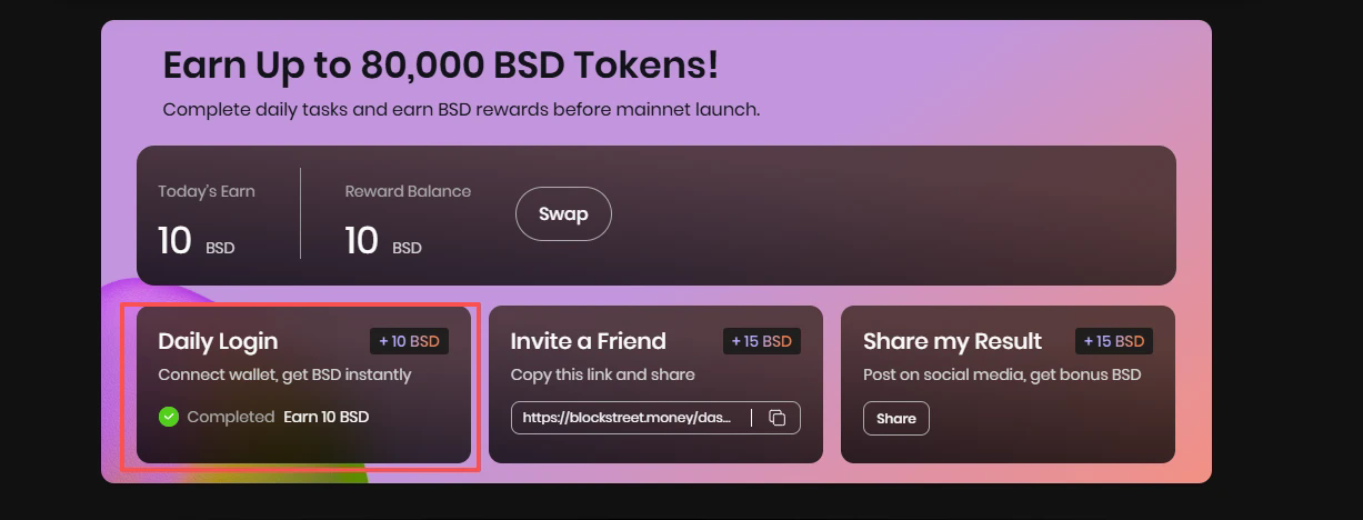 进入官网(链接:https://blockstreet.money/dashboard),连接钱包,首次进入需输入谷歌邮箱完成登录。此后每日进入网站,连接钱包即可自动完成每日签到,获得 10 BSD 测试币。