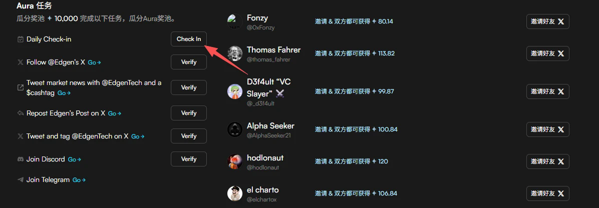 此外,可通过在 X 平台发布优质的 Web 3 内容并附上@EdgenTech,或邀请好友可获得更多 Aura 积分。