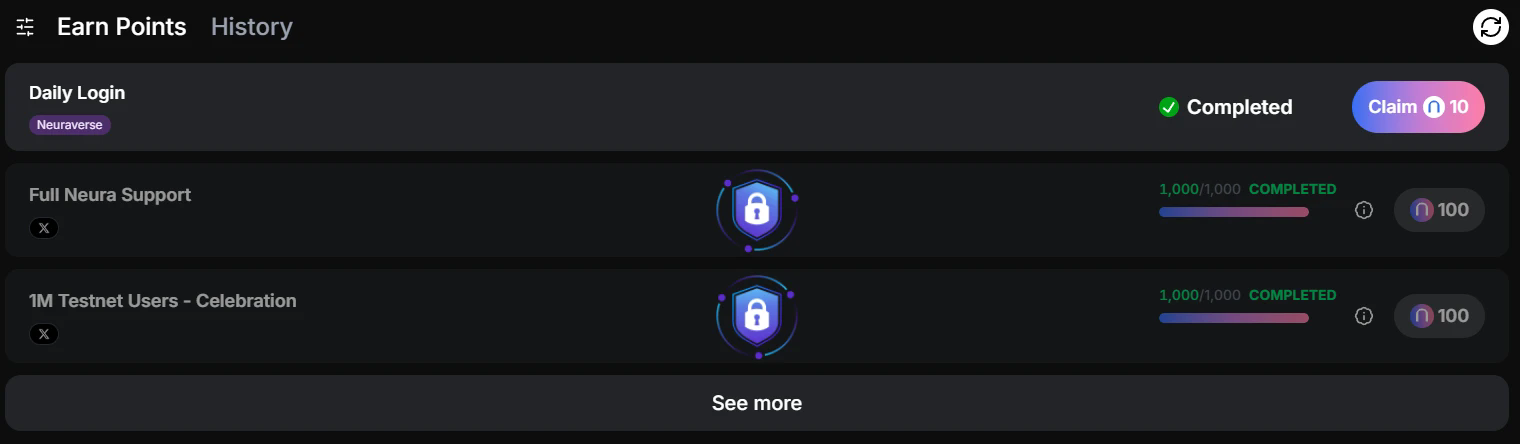 进入交互网站(链接:https://neuraverse.neuraprotocol.io/?section=leaderboard)连接钱包完成账号登录,完成每日任务。