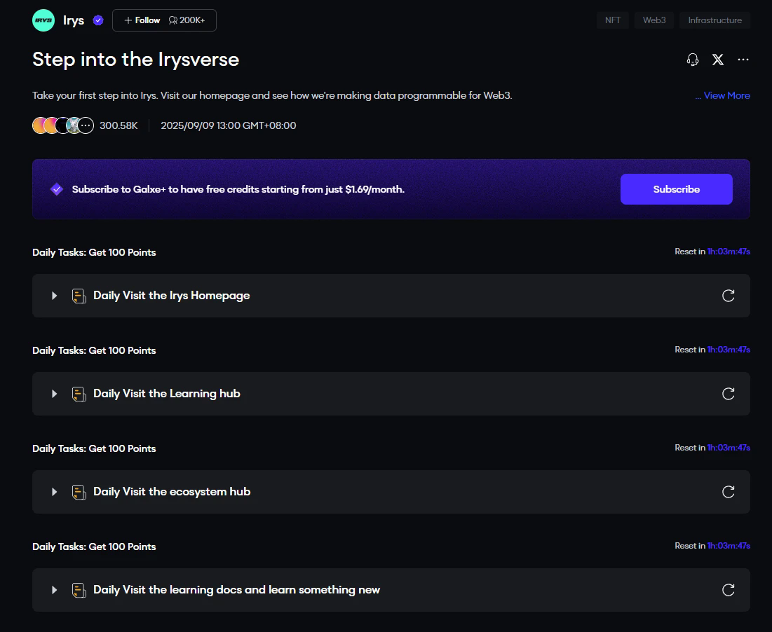 进入 Irys 在 Galxe 上的任务网站(链接:https://app.galxe.com/quest/Irys/GCo13t6RXN?refer=space_home),每日访问指定网站即可获得对应积分奖励。