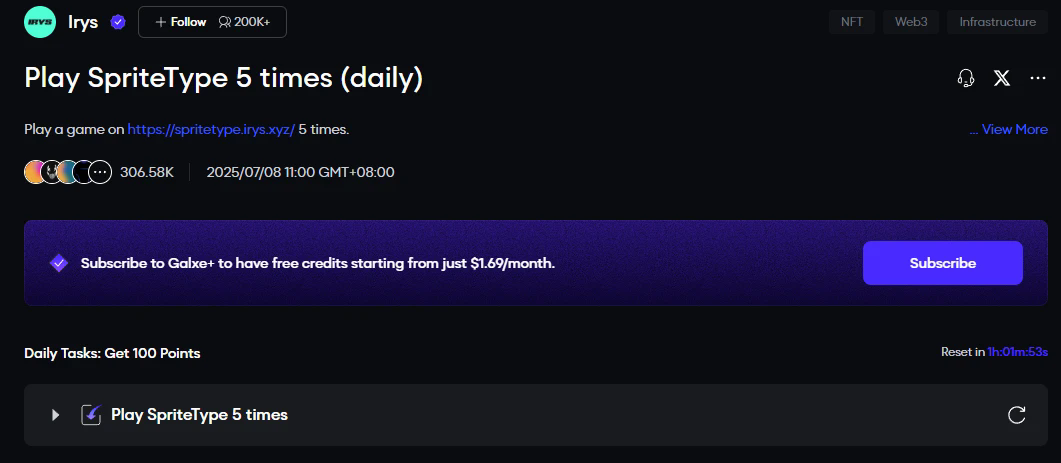 另外,每日玩 5 次打字游戏也可获得在 Galxe 上的积分奖励(链接:https://app.galxe.com/quest/Irys/GCLjLtf7zj?refer=space_home)。