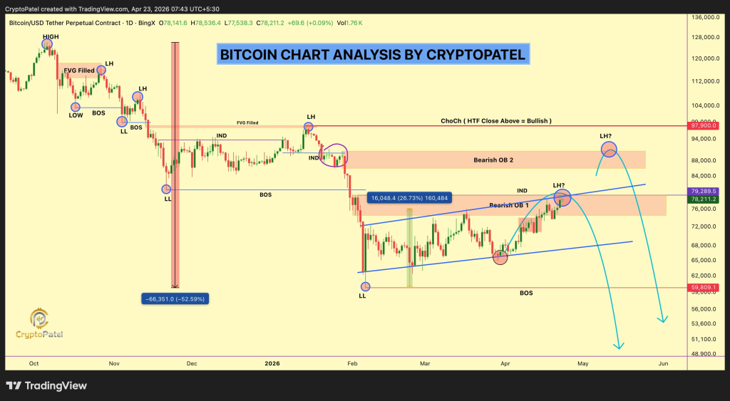 这意味着比特币在确立更强趋势前,可能仍需经历最后一次剧烈回调。即便当前价格稳居78,000美元附近,若阻力位持续承压,此风险依然存在。