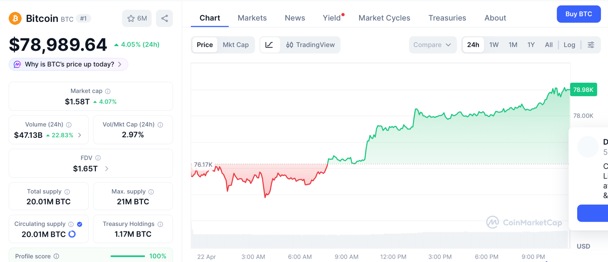 根据CoinMarketCap数据,比特币在4月21日日涨幅2.7%后,交易价格达到78,898美元。