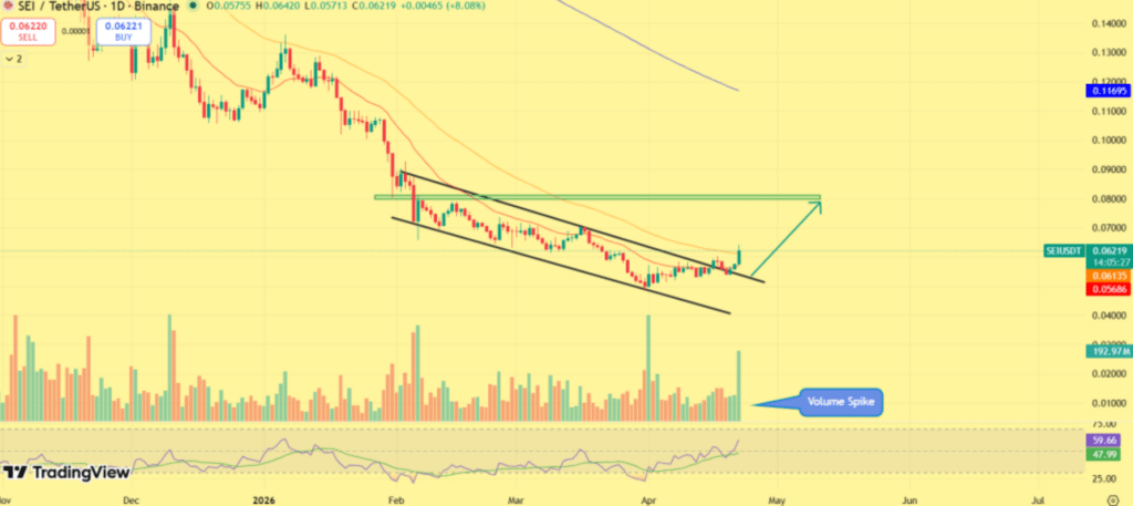 随着SEI突破其下降通道并摆脱持续数周的下跌趋势,价格结构确认了技术性转变。该资产从约0.055美元的低点反弹后,目前交易于0.061至0.062美元区间。此外,20日指数移动平均线已运行至价格下方,凸显短期动能正朝着有利于买方的方向改善。