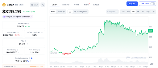 Zcash(ZEC)目前交易价格为329美元,自Foundry矿池启动及SEC调查结束以来月涨幅超45%。其2018年1月创下的3191美元历史高点较现价仍有约885%的上涨空间。
