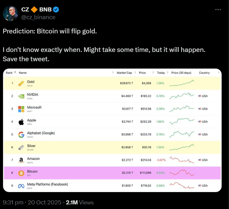 币安联合创始人兼前CEO赵长鹏(CZ)近期重申对加密货币长期潜力的信心,并分享对比特币超越黄金30万亿市值的预期。10月20日他在X平台发文表示,坚信比特币终将实现对黄金的"价值翻转"。