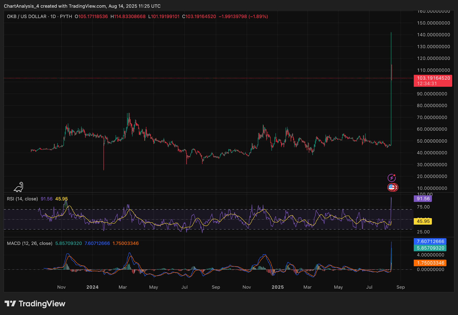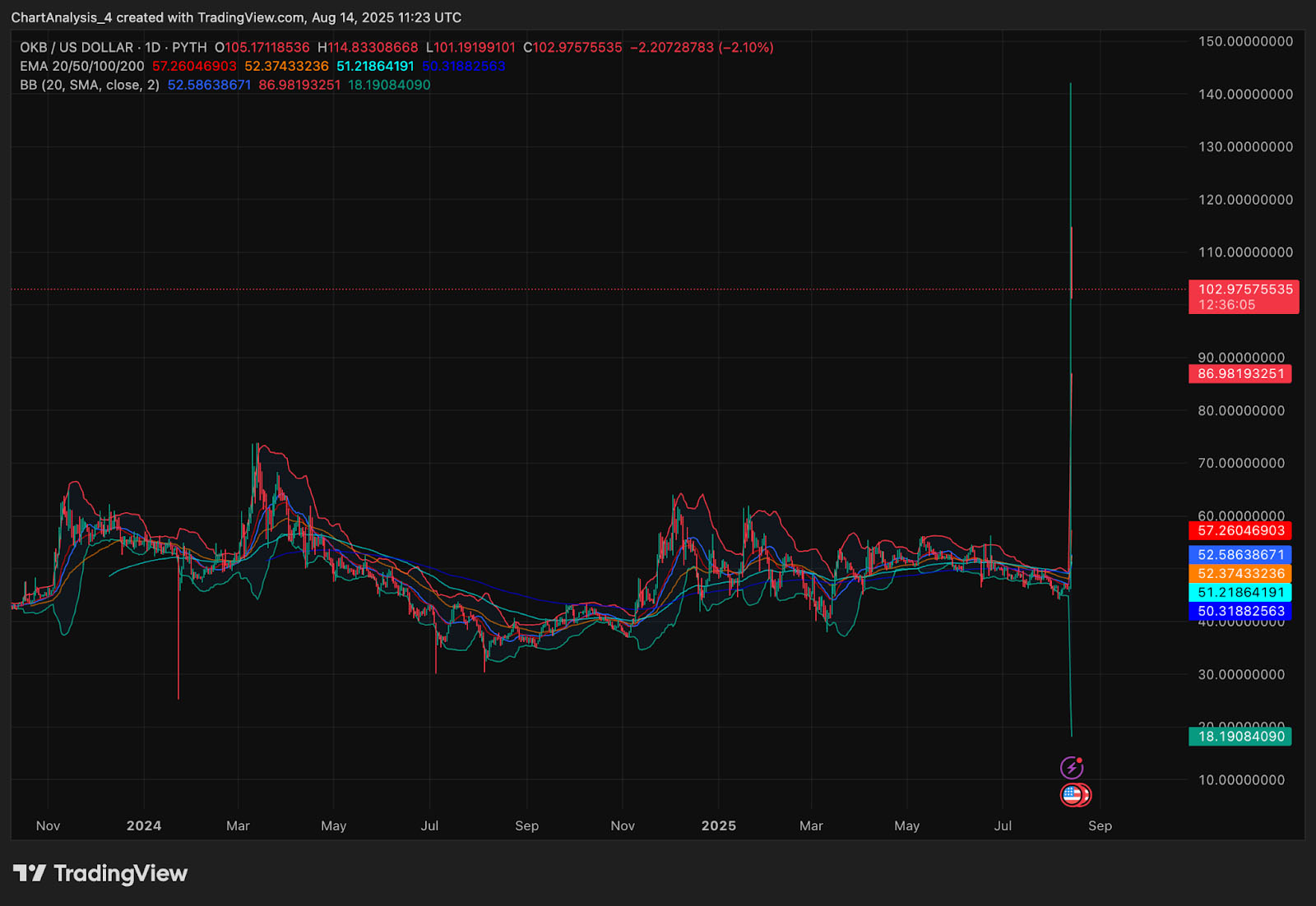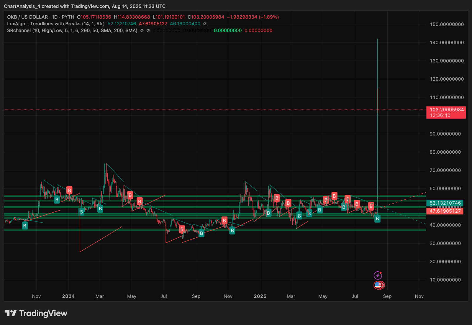 截至2025年8月中旬,OKB交易价格为103.20美元,远高于此前阻力位86.98美元。此次上涨之前,OKB突破了多个供应水平,目前最近的支撑位分别为52.13美元和47.61美元。如果日收盘价持续突破100美元,将使多头在2025年剩余时间内保持主导地位,下一个上行测试目标位在114.83美元附近。下行方面,维持在86.98美元上方将是维持突破结构的关键。