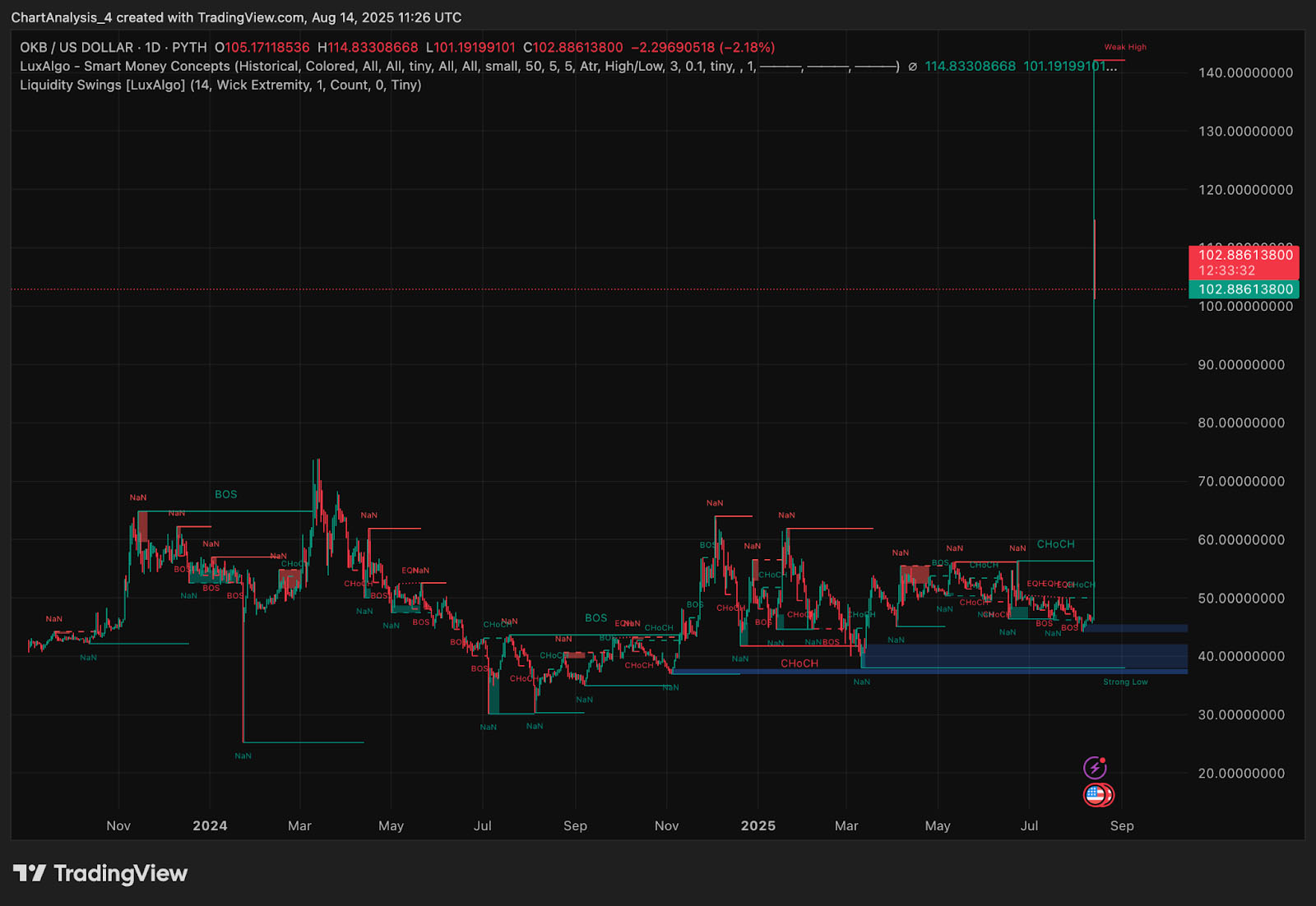 从智能货币概念(SMC)的角度来看,OKB在日线图上突破了多个结构(BOS),最新一轮反弹突破了60美元上方的重要流动性区域。突破100美元意味着价格高点较弱,这可能导致价格继续下探至145美元,或进入回调阶段,回调至86.98-87.00美元的需求区间。