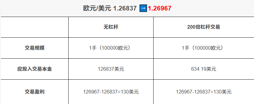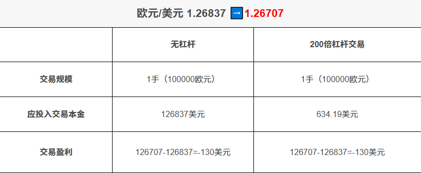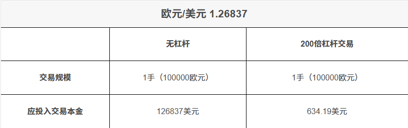 但如果外汇经纪商提供1:200的杠杆,那么投资者仅需投入126,837 * 0.5%= 634.19美元就可以持有总价值为126,837美元的仓位,而其余的资金是向经纪商借入。