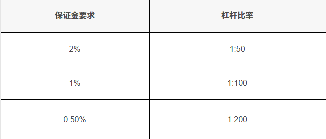 每个经纪商所需要的保证金比例各不相同,具体取决于交易规模。假设交易者买入价值为100,000美元的欧元/美元,交易者可能需要向账户中存入1000美元作为保证金,也就是说保证金要求为1%(1,000/100,000),因此杠杆比率为1:100。以下为保证金要求与杠杆比率的事例: