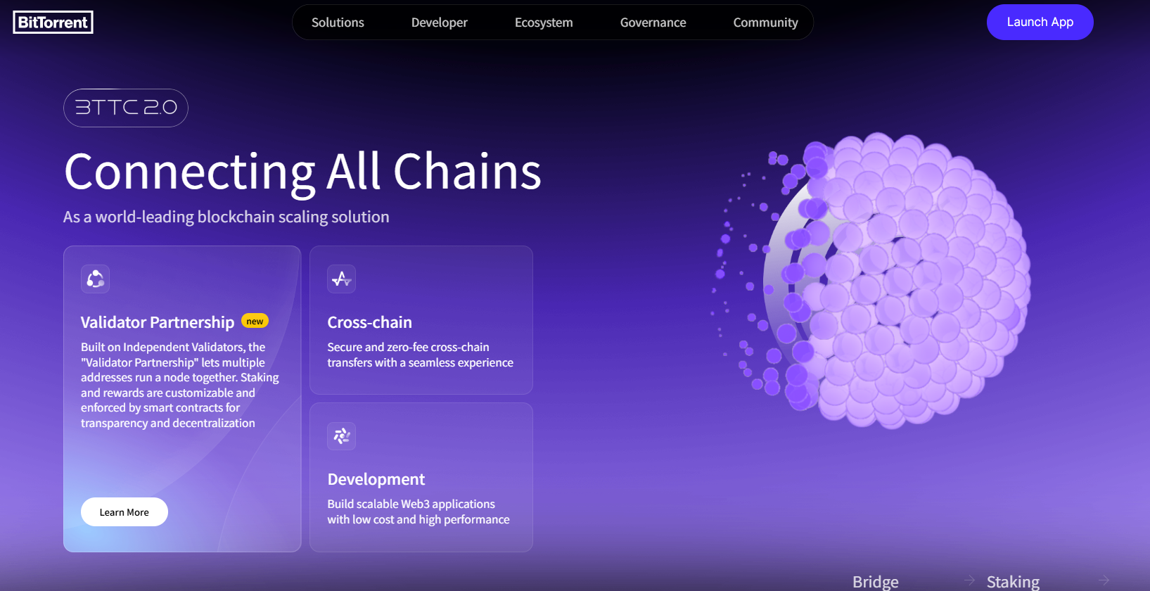 今年6月,BTTC正式升级至2.0版本,通过模块化分层与标准化流程拆解设计,重构跨链技术底层架构。该版本将跨链流程“源链请求发起——信息传输——目标链执行”转化为通用的逻辑与标准化协议,对应搭建起:Root Contracts(根链层:跨链请求发起)——Delivery(中继层:信息传输)——BitTorrent Chain(执行层:DApp应用运行平台层)三层架构,同并采用PoS共识机制。最终,BTTC构建出一个安全、高效且具备扩展性的跨链网络,为实现多链间的资产流转与应用协同提供了坚实的技术基础。