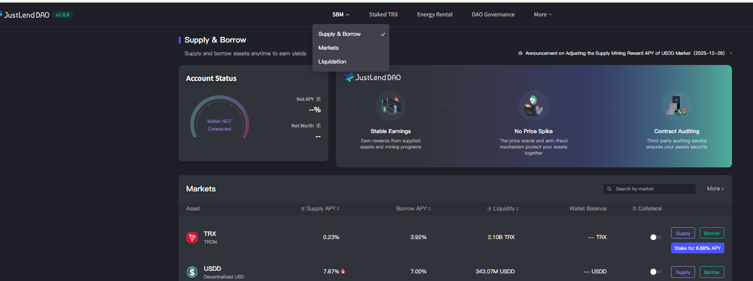 作为波场TRON生态金融设施的核心支柱,JustLend DAO通过持续的功能整合与战略升级,已实现从借贷协议到生态价值枢纽的跨越式发展,构建集资产借贷增值、质押服务、Gas成本优化等于一体的全链路去中心化金融解决方案。