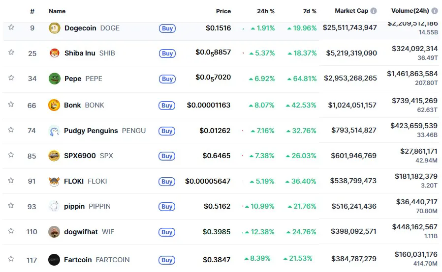 Meme币衍生品市场同样迅速升温,Coinglass数据显示,DOGE过去24小时未平仓合约成交额上涨45.41%、持仓量达到19.41亿美元,PEPE增长33.32%,持仓量达到5.14亿美元,SHIB增长93.66%、WIF增长123.39%、PENGU增长69.04%。
