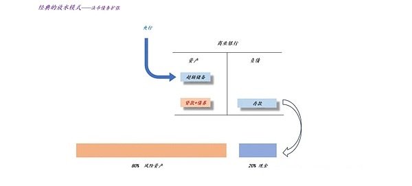 如上图所示,在这种体系下,一方面,央行扩张超额准备金;另一方面,商业银行扩张信用,贷款和债券等法币债务规模膨胀。最终,我们会观察到存款的扩张,以及风险资产价格的膨胀(ps:假设风险偏好维持不变,即居民意愿的现金/风险资产比率)。