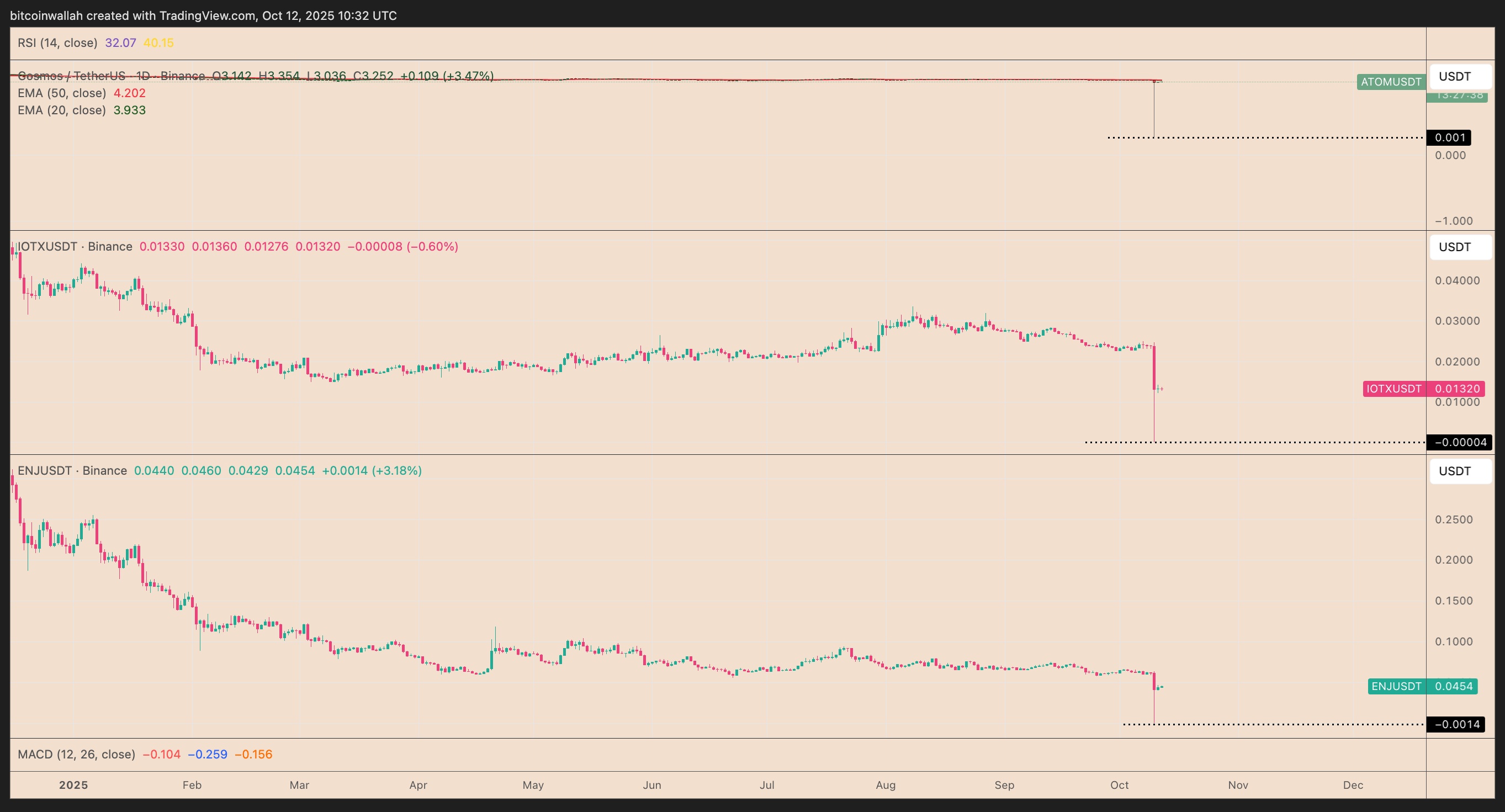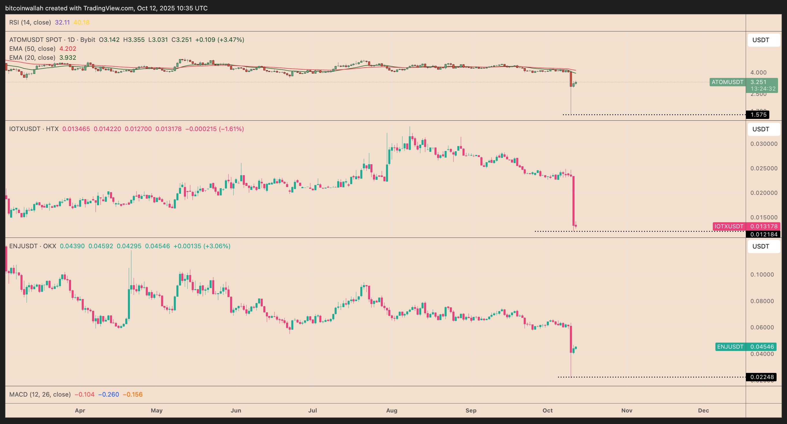 ATOM/USDT, IOTX/USDT, ENJ/USDT在币安的一日图表。来源:TradingView