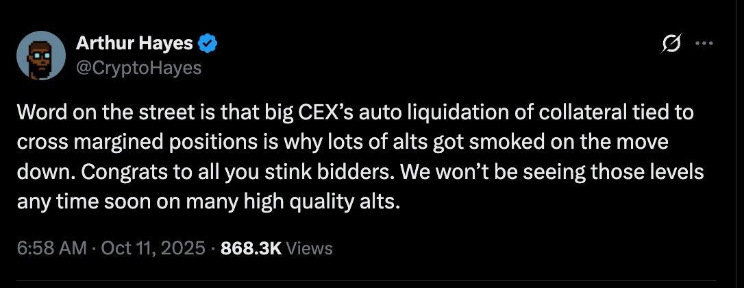 BitMEX联合创始人Arthur Hayes表示,包括币安在内的主要交易所正在“清算与跨保证金头寸相关的抵押品”,这加剧了抛售。