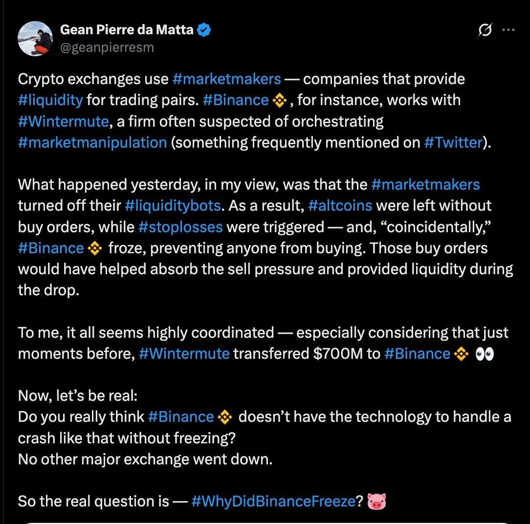 比特币(BTC)下跌约10%-15%,从接近124,000美元的高点跌至105,000美元的低点。相比之下,山寨币表现更为惨烈,尤其是在币安交易的山寨币,许多币种在几分钟内暴跌99.99%-100%。
