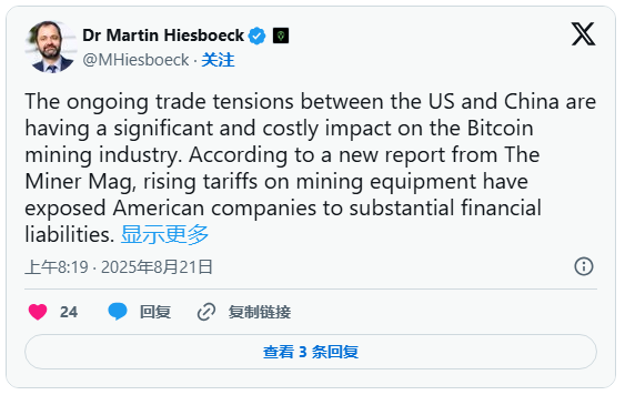 他指出:「要应对这种情况,美国必须培育本土化的比特币矿机供货商生态,以确保在挖矿领域持续推进创新与算力性能优化。」