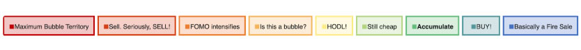 建议查看不同色带内的历史价格行为。请留意比特币价格此前处于类似区间时出现的模式和趋势。例如,此前 BTC 进入“深蓝色”带时,后续出现了什么情况?随后价格是否会迅速上涨,还是会出现横盘整理价格行为?