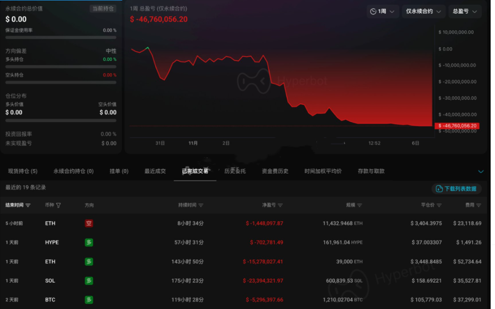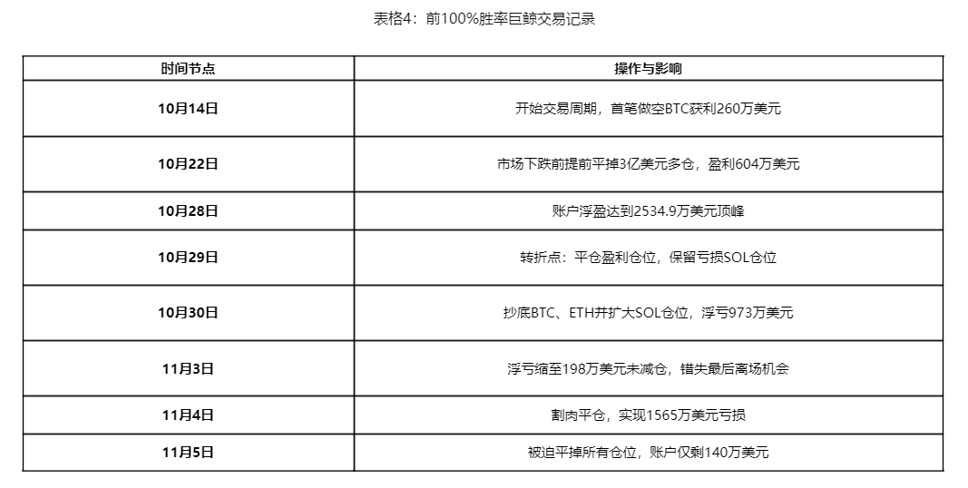 在所有这些巨鲸中,最引人注目的当属那位“前100%胜率巨鲸”。他的故事完整呈现了一个交易员如何从辉煌走向毁灭的全过程,堪称高杠杆交易风险的活教材。