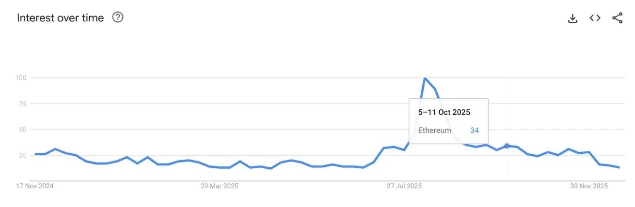 今年7月至9月期间,谷歌趋势数据显示以太坊的搜索热度大幅飙升,这一趋势与ETH企业财库及ETF的发展势头高度吻合。正是这些传统的资产配置渠道,点燃了散户投资者对以太坊的好奇心,而好奇心又进一步转化为市场关注度。