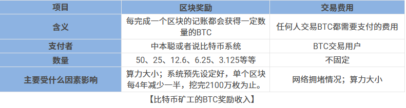 从上述比特币挖矿的含义可以看出,挖矿是有利可图的,可以获得BTC奖励。比特币矿工的奖励,主要分为两部分:区块奖励和交易费用(也称“Gas费用”),具体如下: