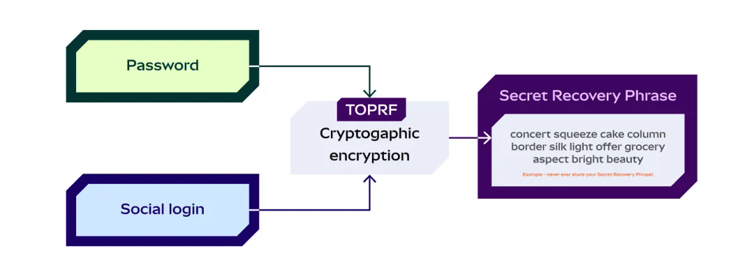 他的做法很简单,用户要登录一个邮箱并且设置一个密码,两者结合形成一个叫TOPRF(Threshold Oblivious Pseudorandom Function阈值不经意伪随机函数)的东西,用这个去加密了用户的私钥,被加密的私钥自然可以备份。